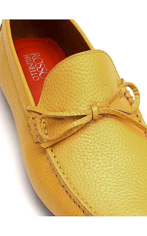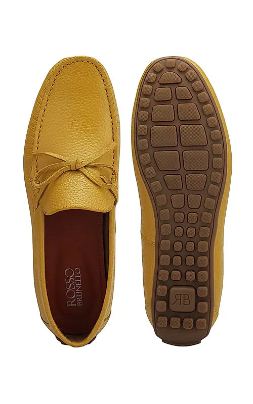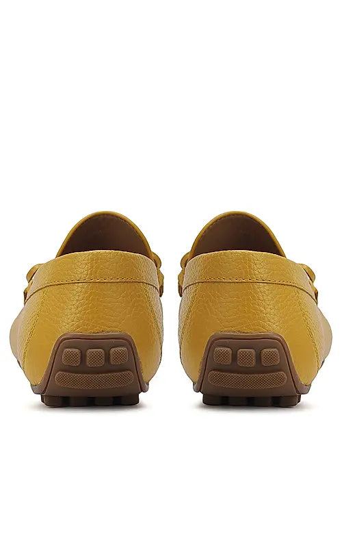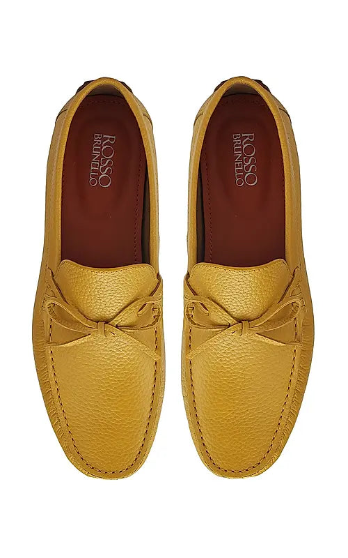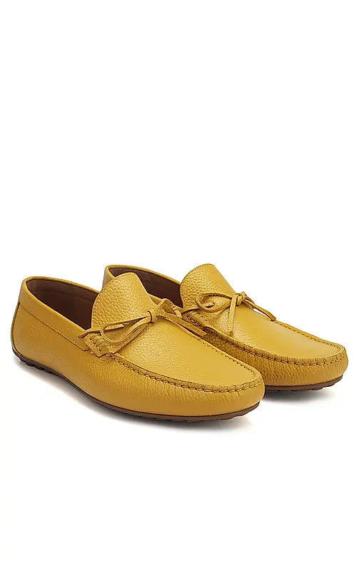 Elevate your style with these yellow leather moccasins for men, featuring a subtle bow detail. Designed for comfort and a refined look, they're perfect for both casual and semi-formal occasions. Enjoy effortless sophistication and ease with every wear.