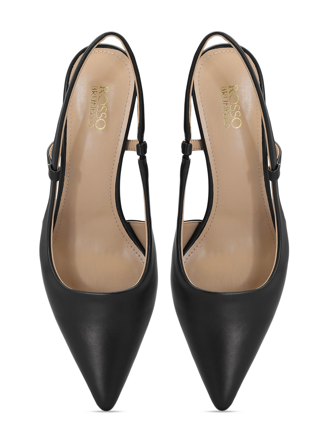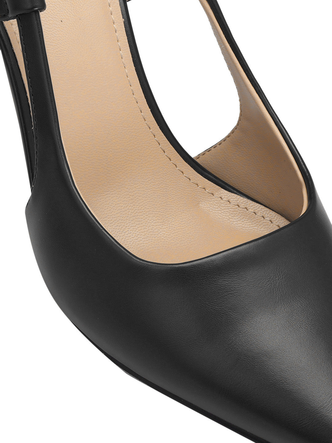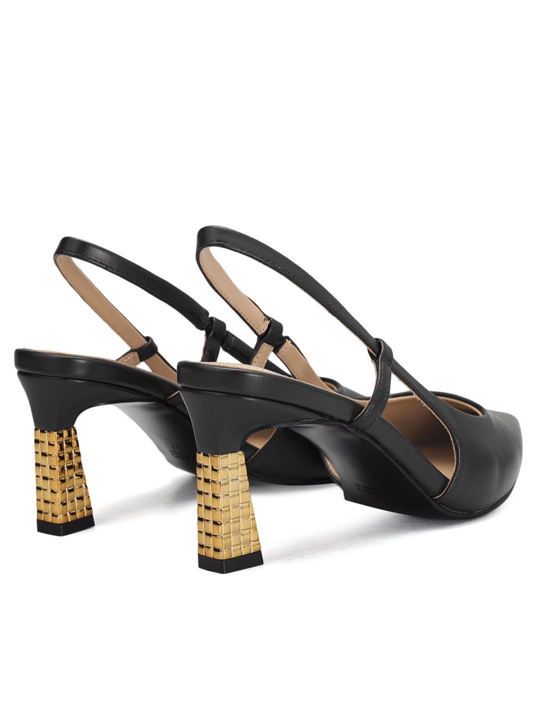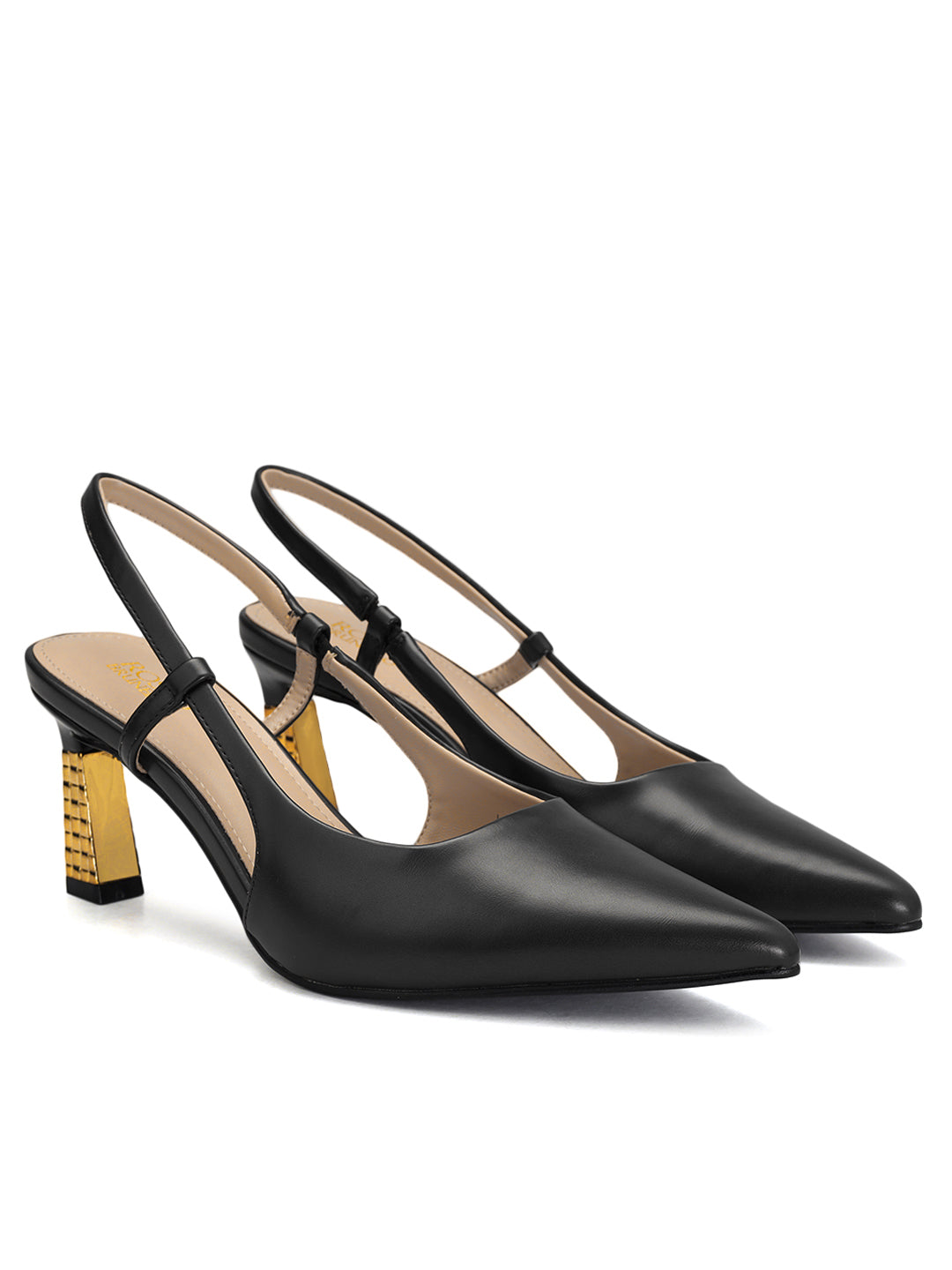 Step into sophistication with our black slingback heels, featuring a refined pointed toe and luxurious gold heels. Crafted for comfort without compromising style, these shoes are the epitome of elegance for formal occasions. Elevate your ensemble with this timeless addition to your wardrobe.