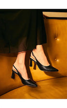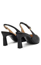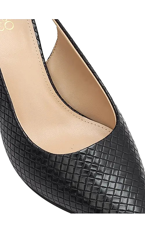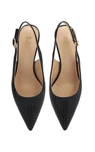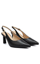 Introducing our elegant black textured leather slingback heels, perfect for formal occasions. With a timeless pointed toe design and crafted for comfort, elevate your professional attire with confidence.