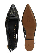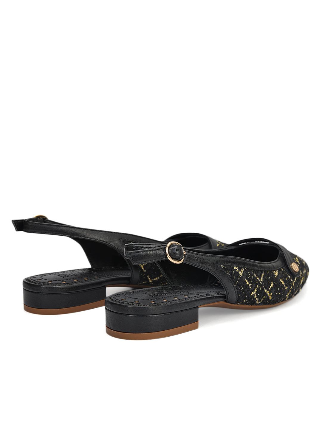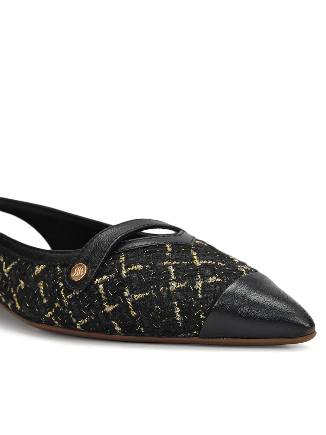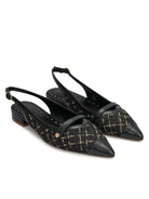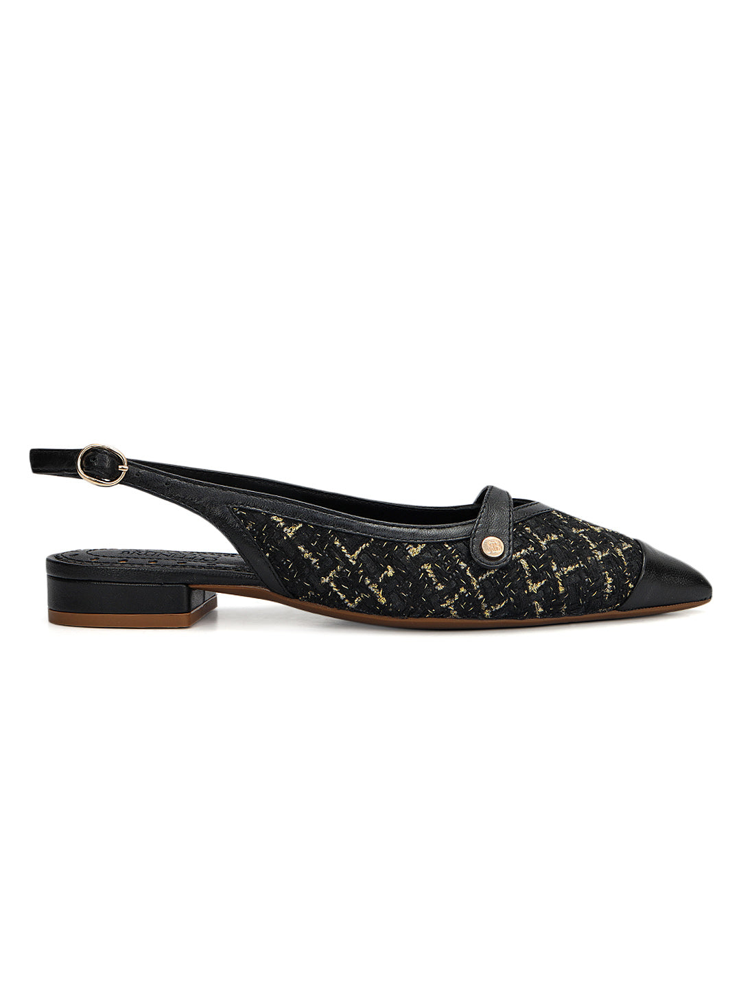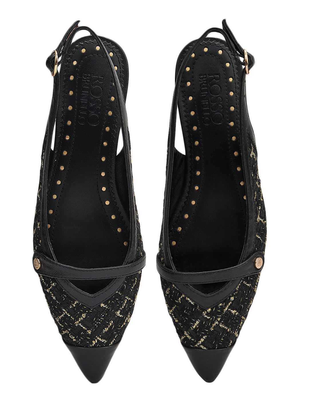Crafted with a textured fabric upper and leather detailing, these black slingback flats offer a refined, polished look. The pointed toe and secure slingback strap ensure a comfortable fit with everyday ease. Perfect for formal settings and elegant day-to-evening wear.