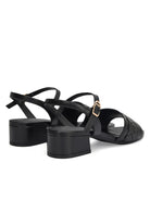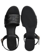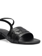 Crafted in premium leather, these black block heel sandals feature a woven front strap for a refined look. Designed with a supportive ankle strap and a stable block heel, they offer comfort and ease throughout the day. Ideal for workwear and polished evening ensembles.