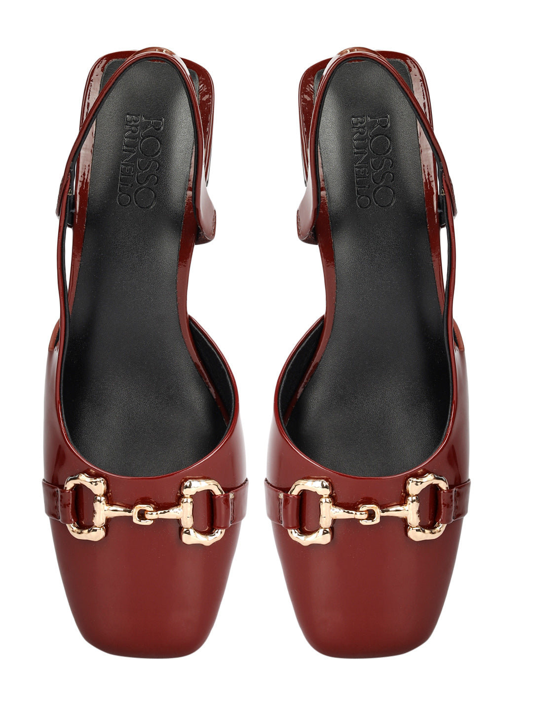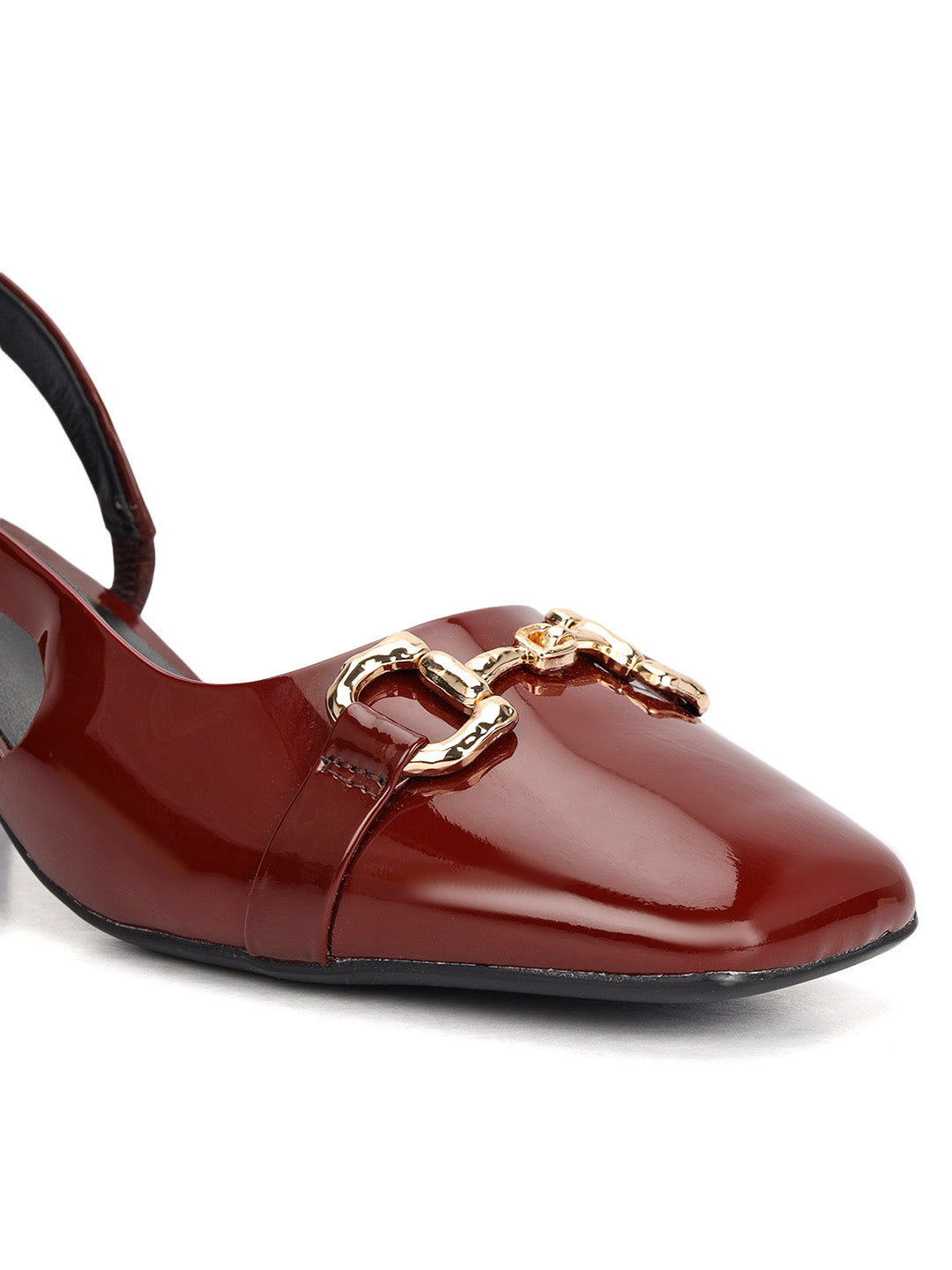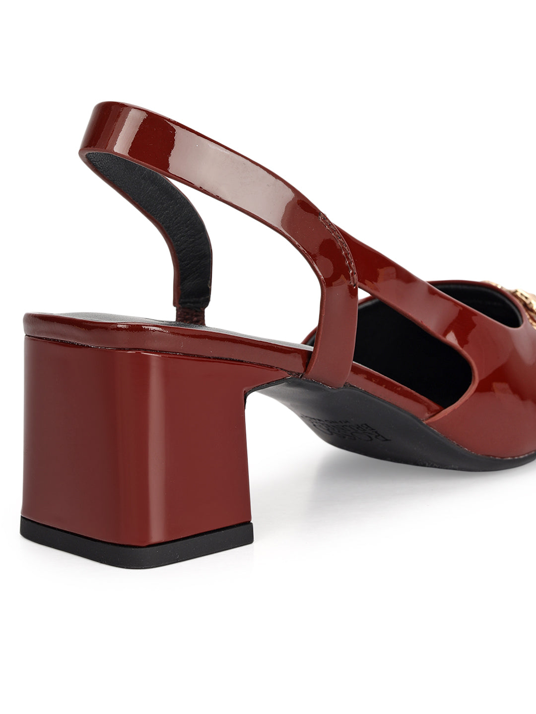 Step into elegance with these burgundy block heels crafted in glossy patent leather. Designed with a sleek slingback style and accented with a bold gold buckle on top, they strike the perfect balance between formal sophistication and everyday comfort—ideal for workdays or evening outings.