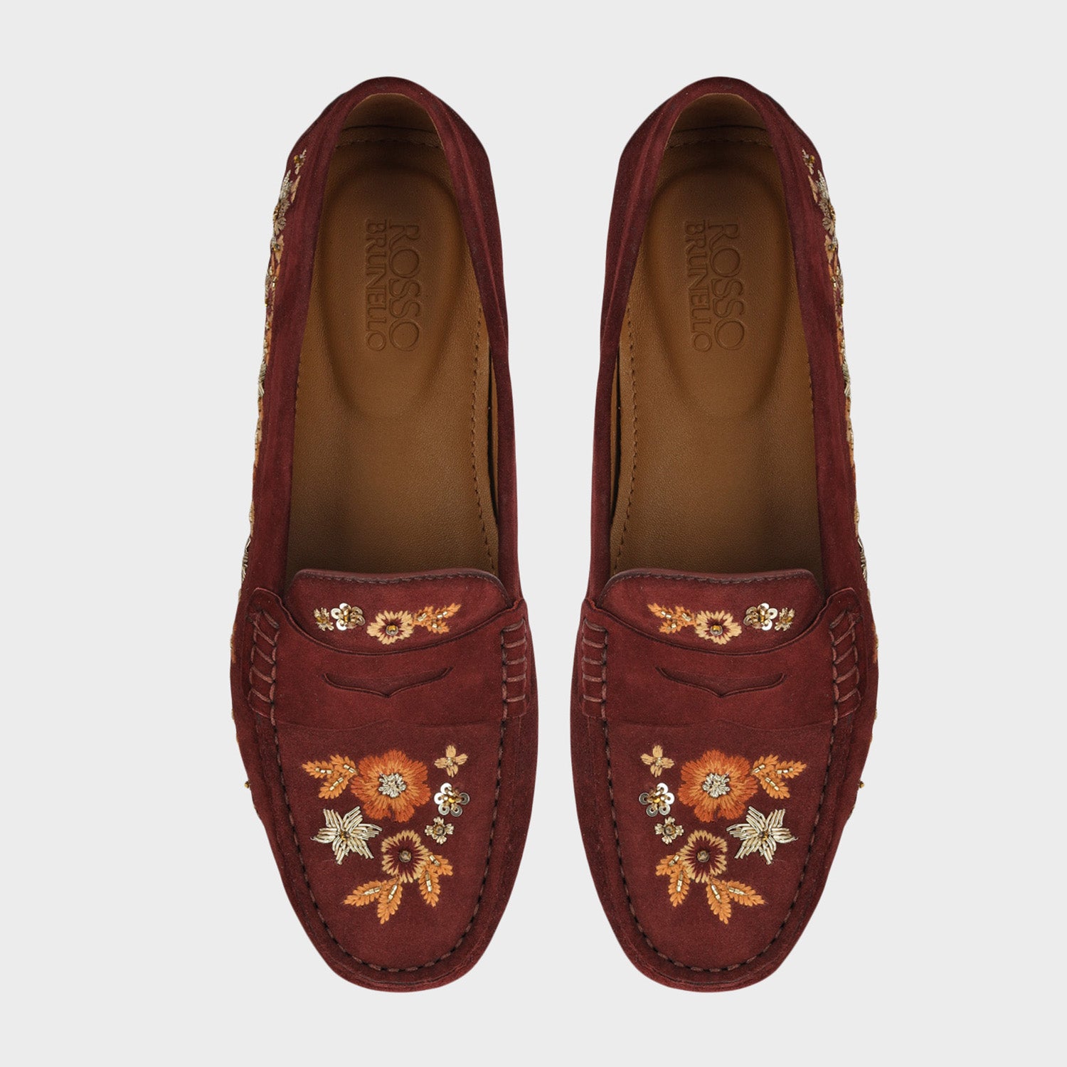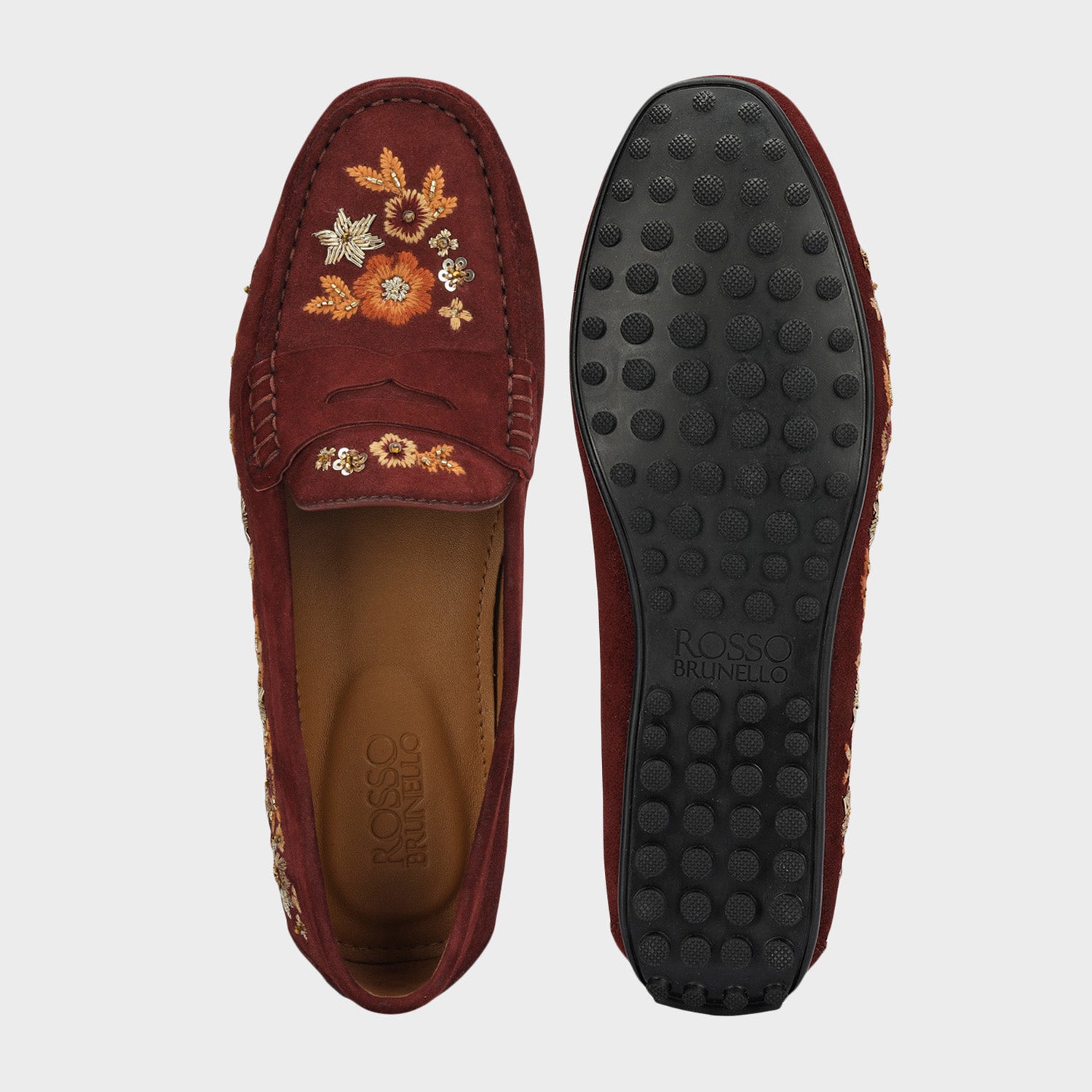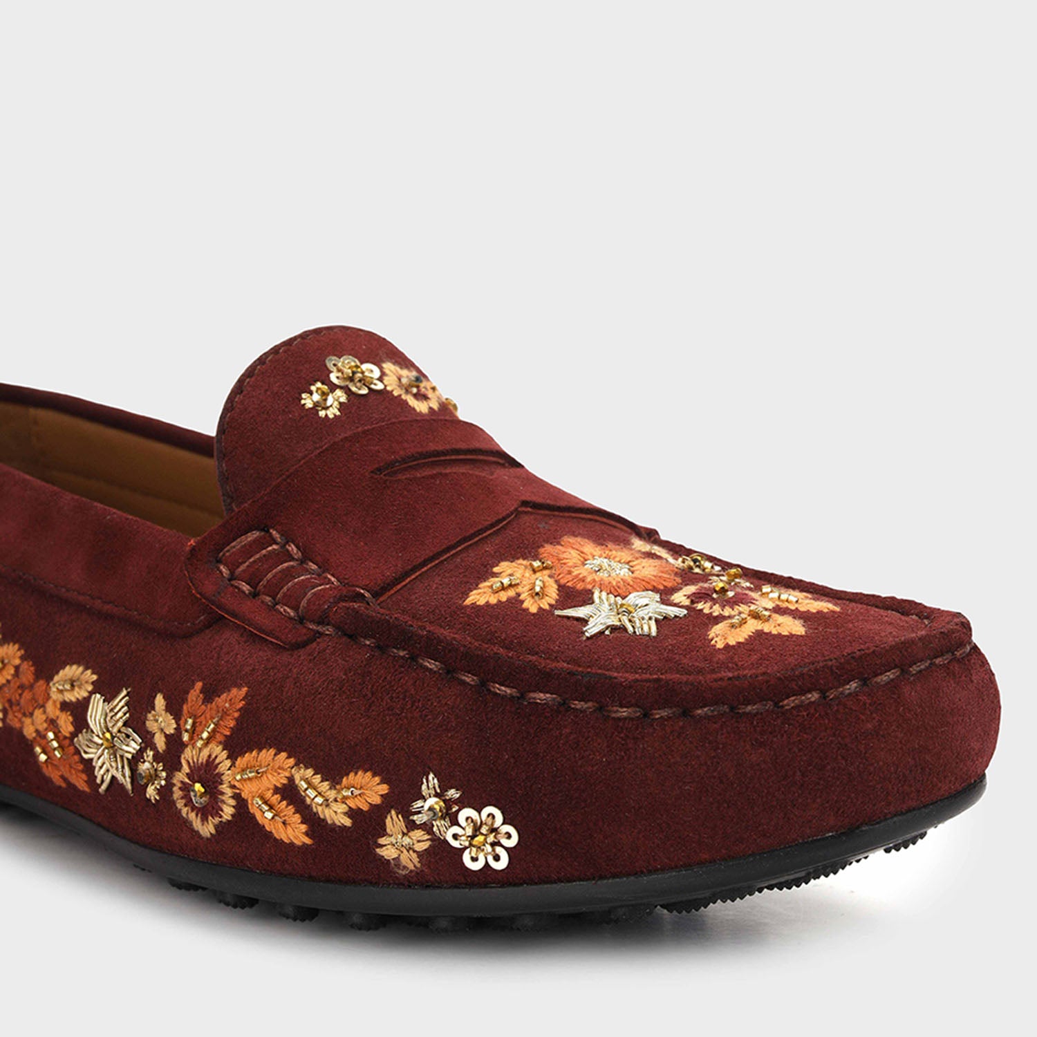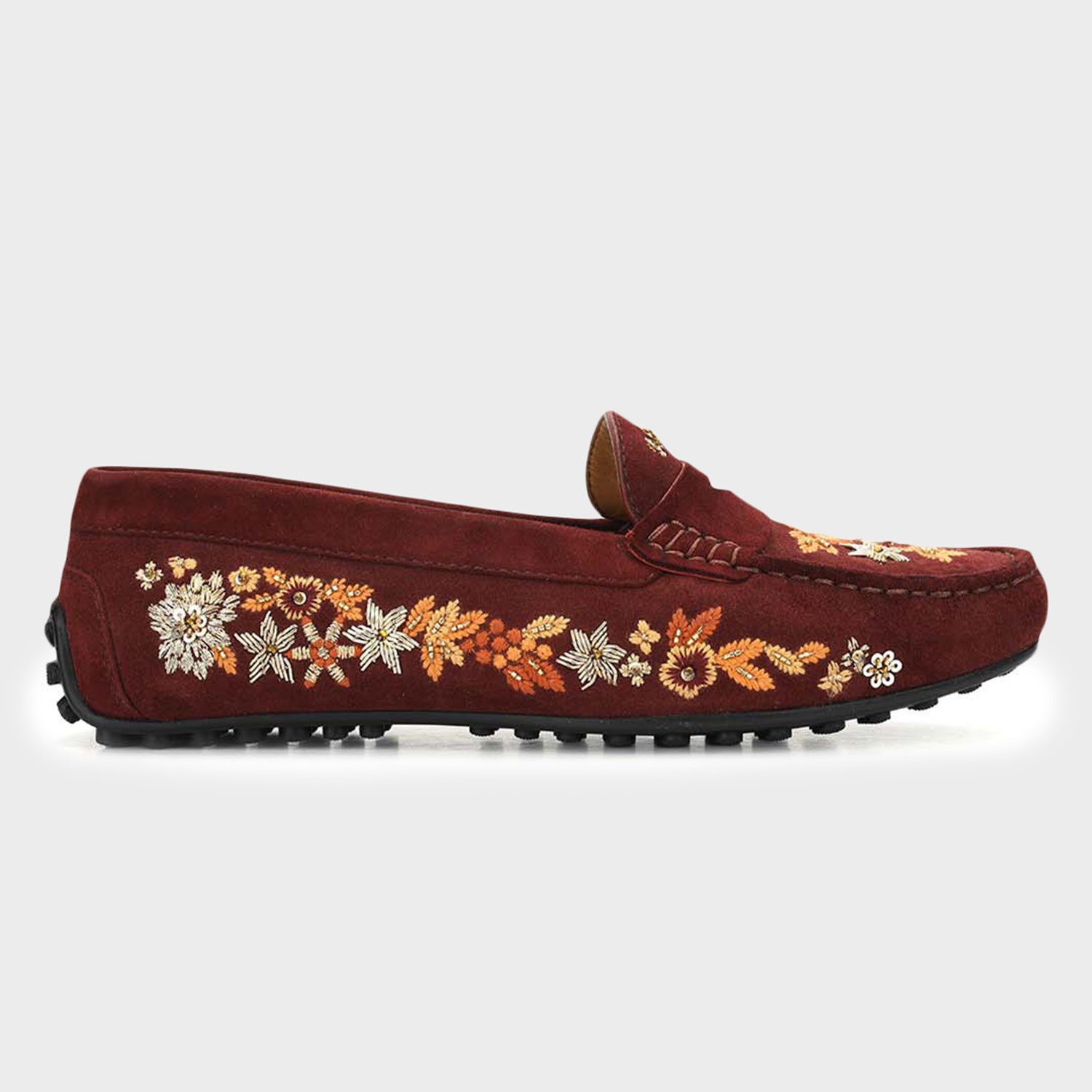 Designed in a rich burgundy finish, these women moccasins feature delicate floral embroidery that adds a refined touch. The soft upper and cushioned footbed ensure a comfortable feel for extended wear. Perfect for festive gatherings or smart casual outings, they blend style with everyday ease.