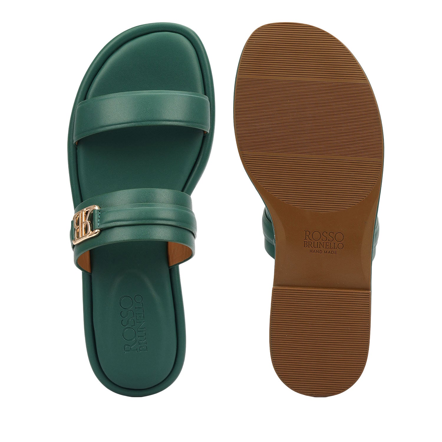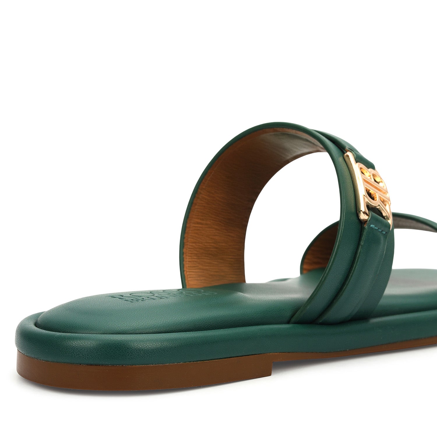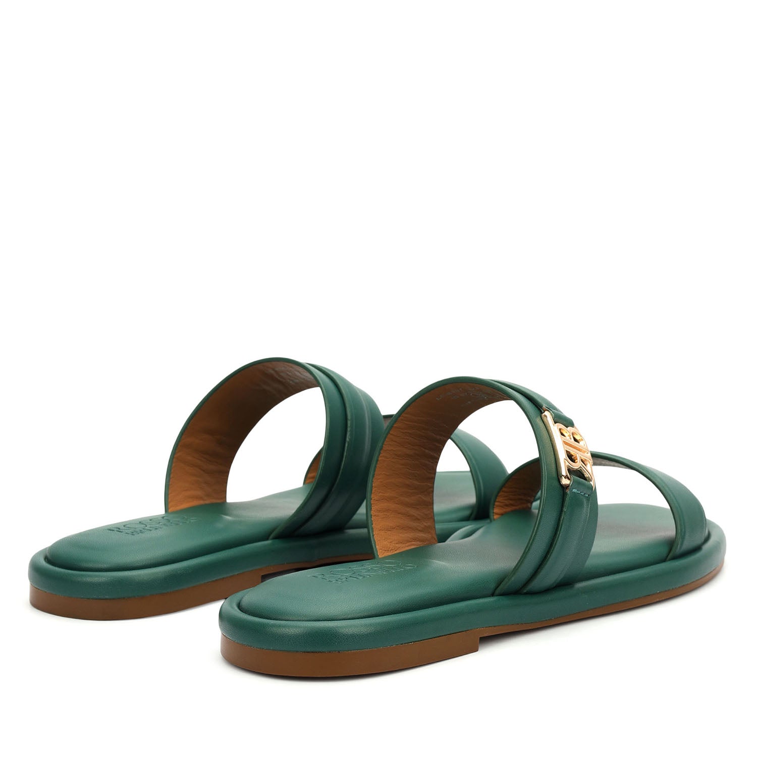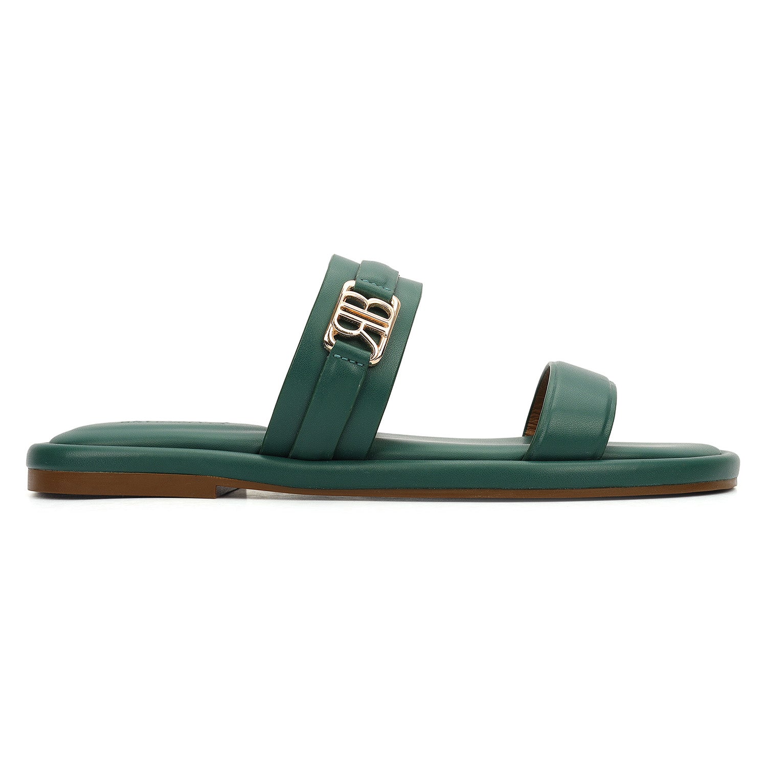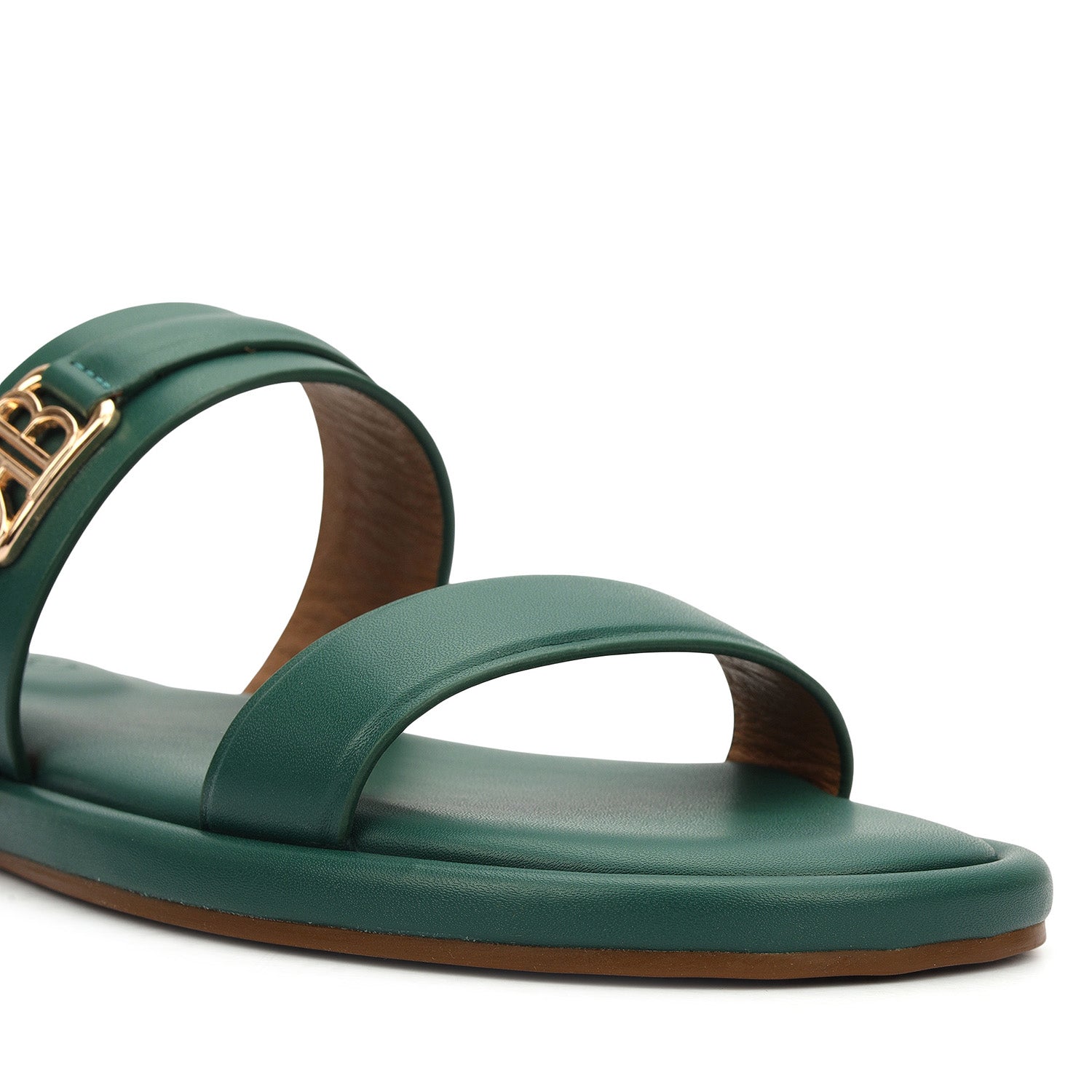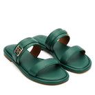 Smooth green leather defines these flats, featuring a clean double-strap design accented with a subtle gold detail. A cushioned footbed ensures day-long comfort, while the easy slip-on style and minimal silhouette make them a versatile choice for both everyday wear and refined outings.