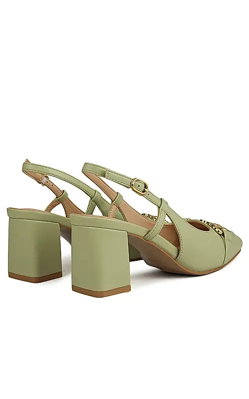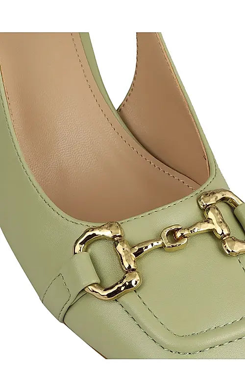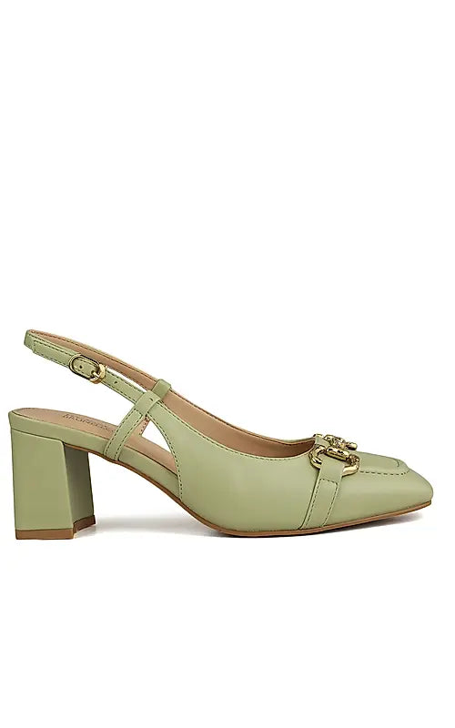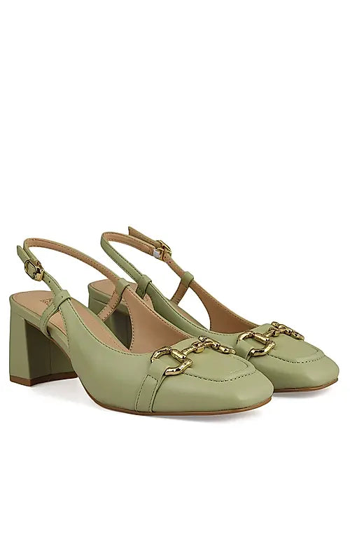 Step out in sleek sophistication with our green block heels featuring a chic gold buckle accent. Designed for both style and comfort, elevate any outfit effortlessly.