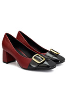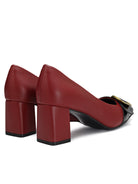 Step into sophistication with our Red Block Heels, adorned with a gleaming gold buckle. Elevate any ensemble with their timeless charm and effortless style.