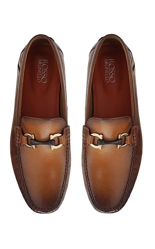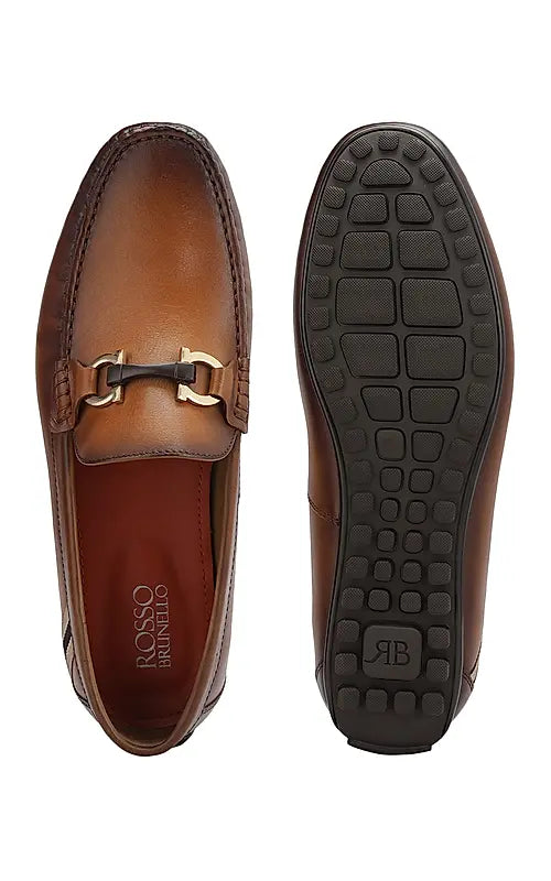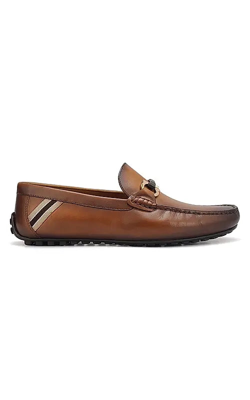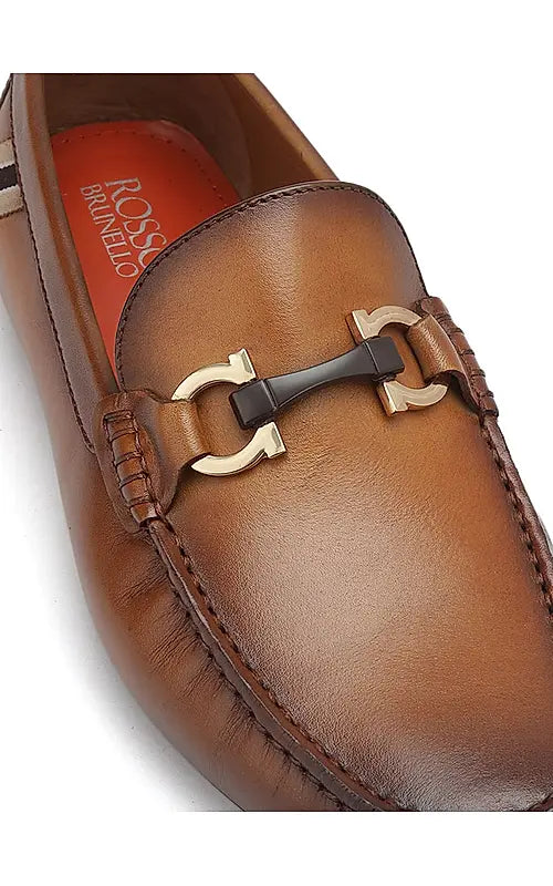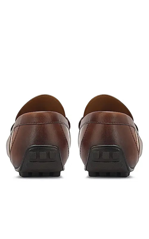 Elevate your style with these men's moccasins, crafted from plain leather for a refined look. A sleek metal buckle on top adds a touch of sophistication, while striped trims at the heel enhance the modern design. Comfortable and stylish, they're the perfect choice for party wear.