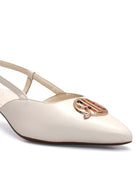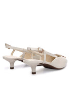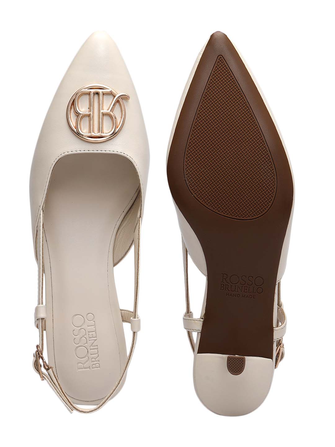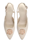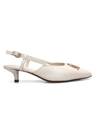 Elevate your look with these white leather slingback heels, designed with a sleek pointed toe and kitten heel for added sophistication. The signature RB monogram detail on the front adds a touch of refined charm. Finished with an adjustable buckle strap and cushioned insole, they offer both style and comfort for any occasion.